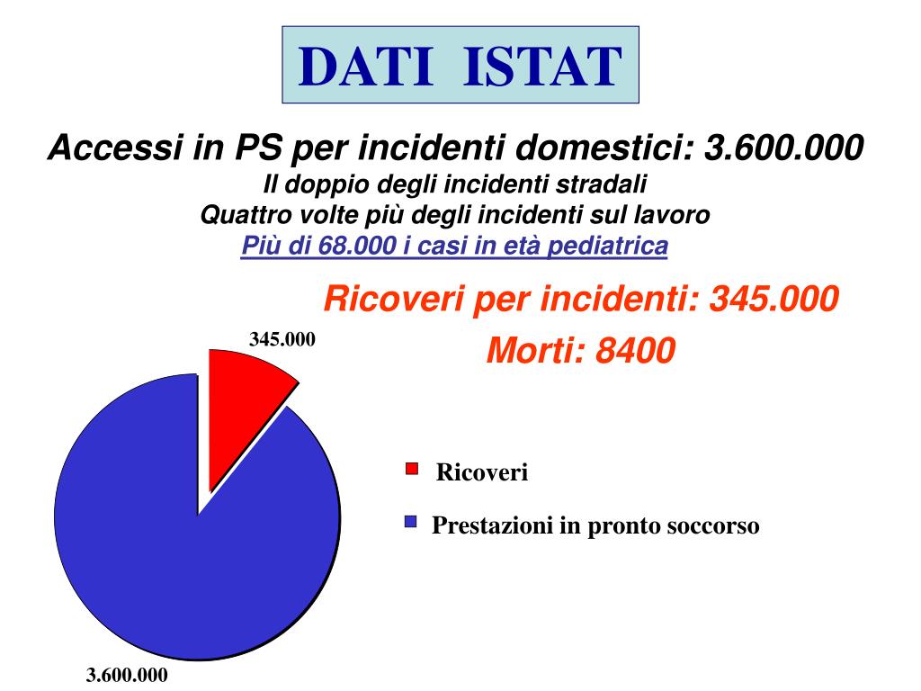 345.000 Ricoveri Prestazioni in pronto soccorso 3.600.000 DATI ISTAT Accessi in PS per incidenti domestici: 3.600.000 Il doppio degli incidenti stradali Quattro volte più degli incidenti sul lavoro Più di 68.000 i casi in età pediatrica Ricoveri per incidenti: 345.000 Morti: 8400