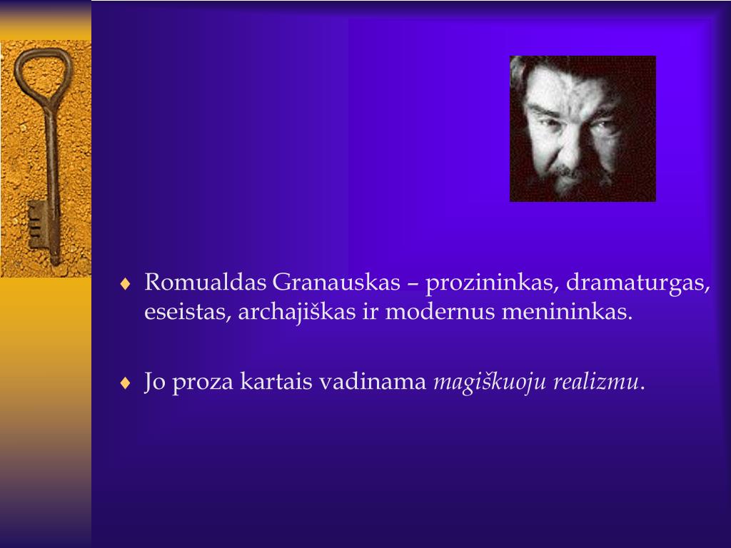 Romualdas Granauskas – prozininkas, dramaturgas, eseistas, archajiškas ir modernus menininkas. • Jo proza kartais vadinama magiškuoju realizmu.