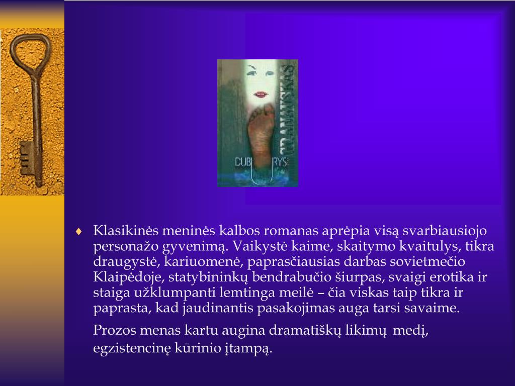 Meninės vaizduotės esmė • Kūrybai būdingi pastovūs gamtos ir buities vaizdai – kiemas, šulinys, medis, paukštis, saulėlydis – visa tai, kas amžinai šalia žmogaus. • Pasakojama užuominomis, veikėjai kalba mažai, labiau už žodžius juos sieja bendri daiktai ir darbai.