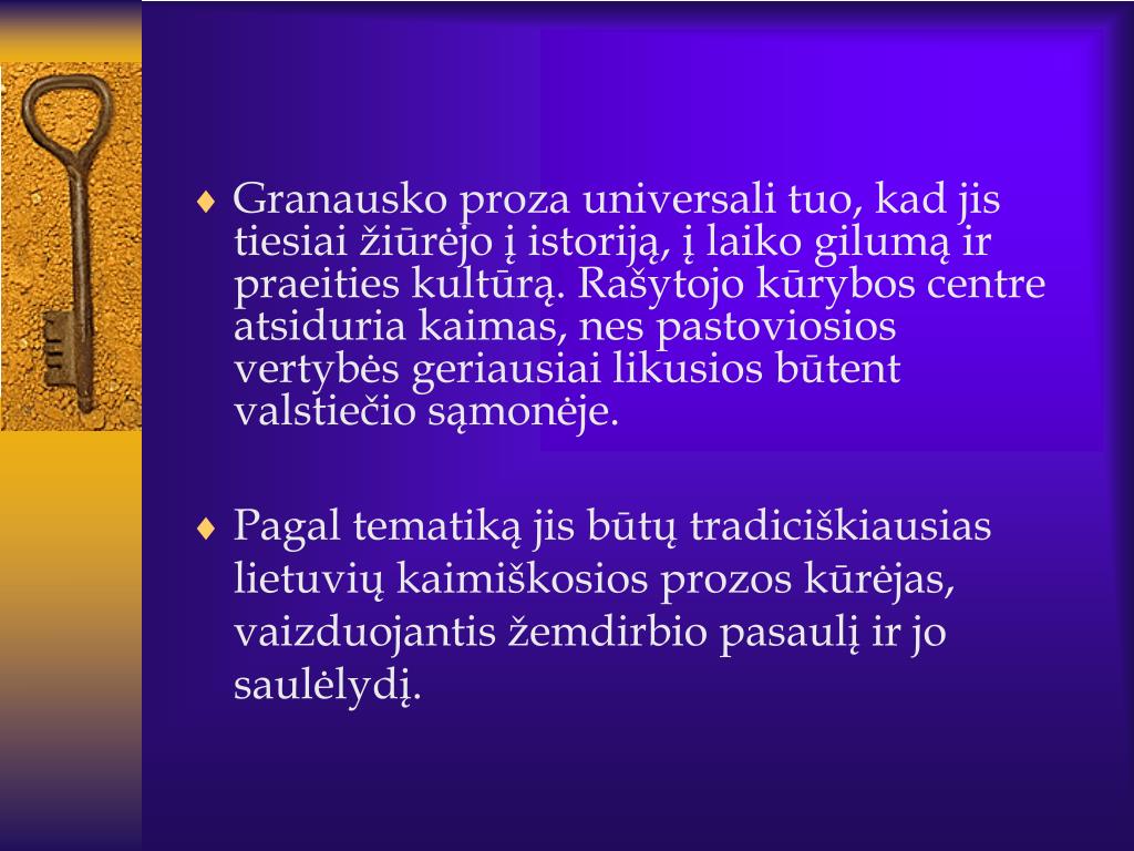 Granausko meno paslaptis • Ji yra mitologinė, archetipinė gelmė, amžinieji gyvenimo pavidalai žmoguje ir pasaulyje. • Rašytoją traukia ilgaamžė žemdirbio patirtis, pasaulio vaizdas ir žmogaus būsena. • Išryškinama kolektyvinė, amžiais kaupta valstiečių patirtis. • Esminis veikėjo tipas – pagyvenęs žmogus.