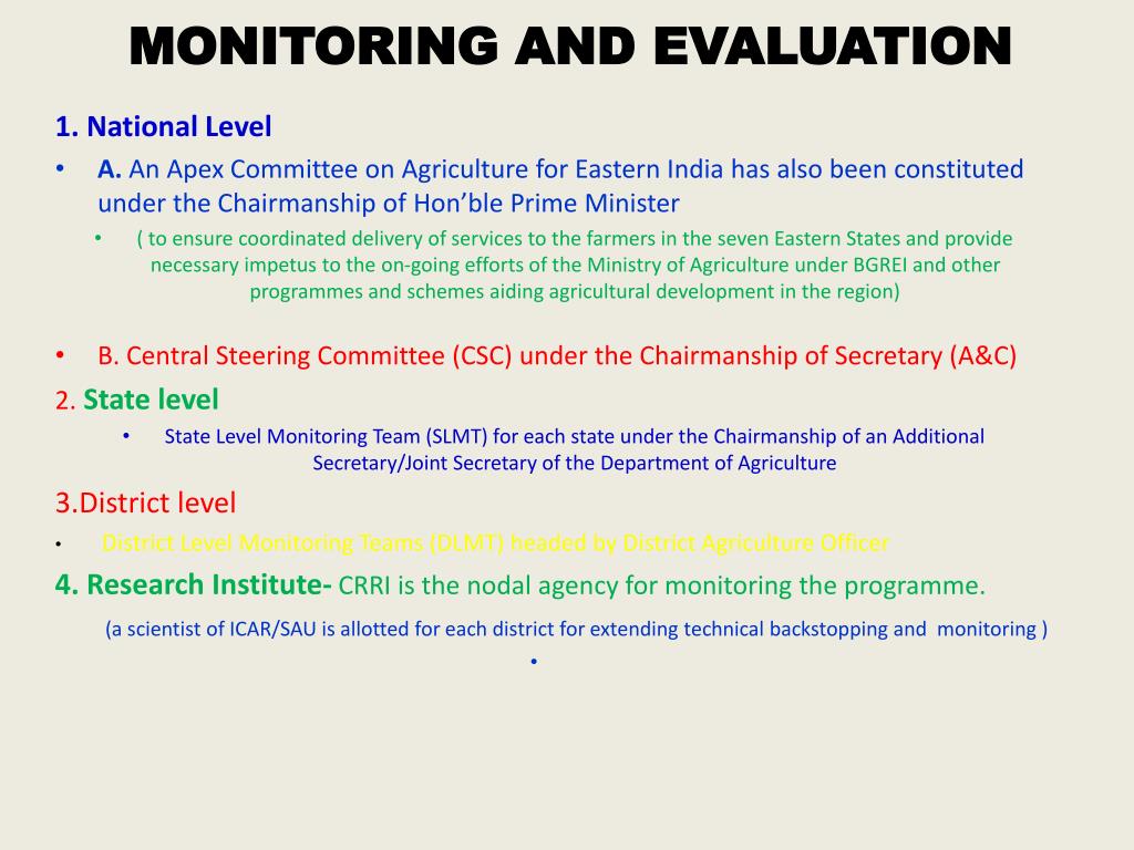 MONITORING AND EVALUATION 1. National Level • A. An Apex Committee on Agriculture for Eastern India has also been constituted under the Chairmanship of Hon’ble Prime Minister • ( to ensure coordinated delivery of services to the farmers in the seven Eastern States and provide necessary impetus to the on-going efforts of the Ministry of Agriculture under BGREI and other programmes and schemes aiding agricultural development in the region) • B. Central Steering Committee (CSC) under the Chairmanship of Secretary (A&C) 2. State level • State Level Monitoring Team (SLMT) for each state under the Chairmanship of an Additional Secretary/Joint Secretary of the Department of Agriculture 3.District level • District Level Monitoring Teams (DLMT) headed by District Agriculture Officer 4. Research Institute- CRRI is the nodal agency for monitoring the programme. (a scientist of ICAR/SAU is allotted for each district for extending technical backstopping and monitoring )