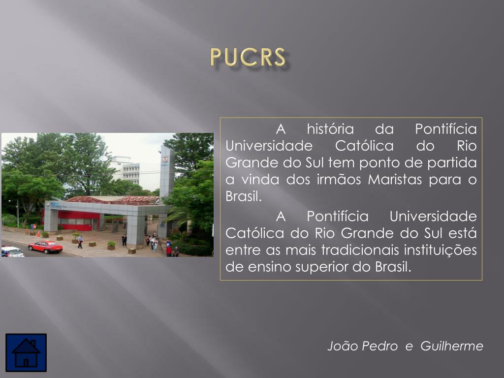 PUCRS A história da Pontifícia Universidade Católica do Rio Grande do Sul tem ponto de partida a vinda dos irmãos Maristas para o Brasil. A Pontifícia Universidade Católica do Rio Grande do Sul está entre as mais tradicionais instituições de ensino superior do Brasil. João Pedro e Guilherme