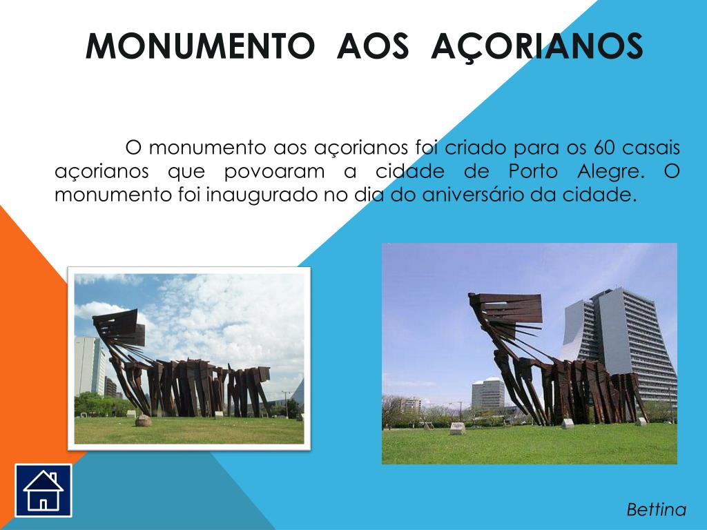 MONUMENTO AOS AÇORIANOS O monumento aos açorianos foi criado para os 60 casais açorianos que povoaram a cidade de Porto Alegre. O monumento foi inaugurado no dia do aniversário da cidade. Bettina
