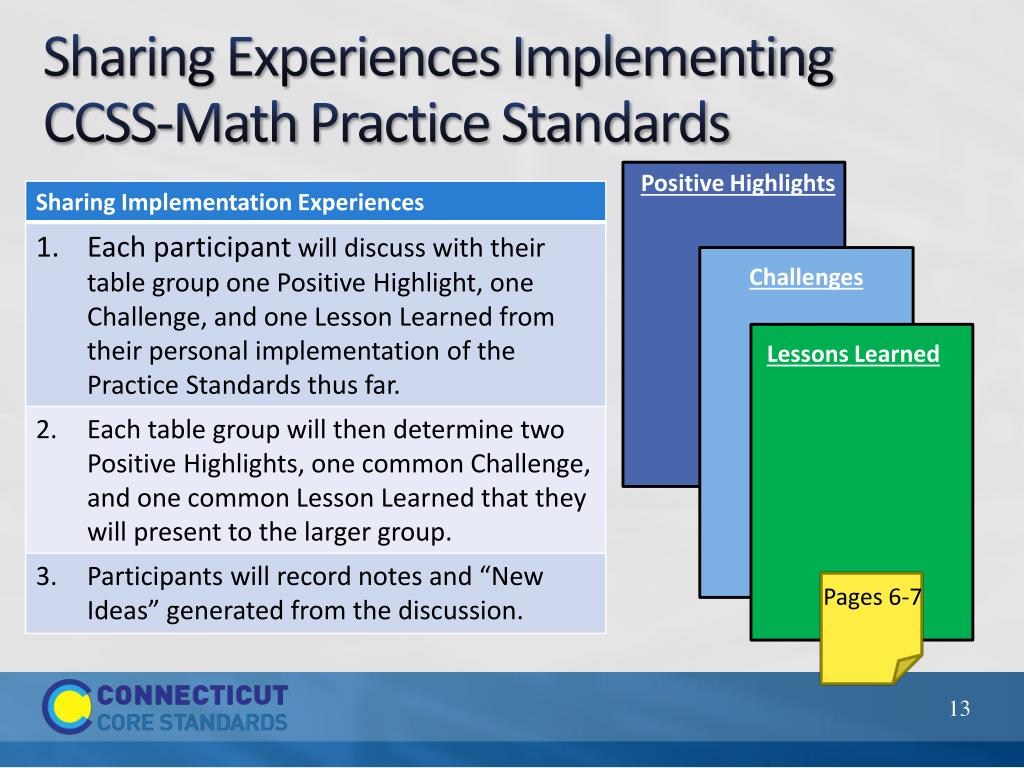 Sharing Experiences Implementing CCSS-Math Practice Standards Positive Highlights Challenges Lessons Learned Pages 6-7 Guide Pages 8-9