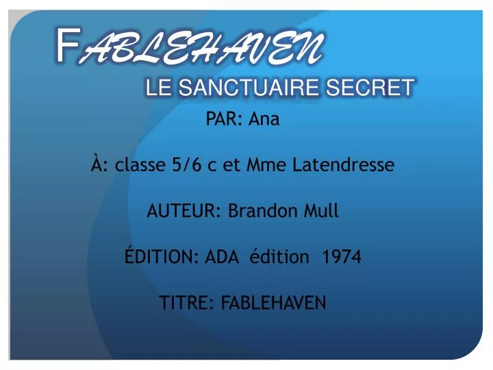 PAR: Ana À: classe 5/6 c et Mme Latendresse AUTEUR: Brandon Mull ÉDITION: ADA édition 1974 TITRE: FABLEHAVEN FABLEHAVEN LESANCTUAIRESECRET
