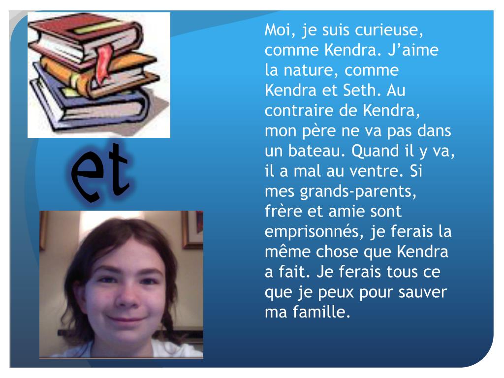 Moi, je suis curieuse, comme Kendra. J’aime la nature, comme Kendra et Seth. Au contraire de Kendra, mon père ne va pas dans un bateau. Quand il y va, il a mal au ventre. Si mes grands-parents, frère et amie sont emprisonnés, je ferais la même chose que Kendra a fait. Je ferais tous ce que je peux pour sauver ma famille. et