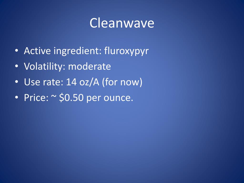 Cleanwave • Active ingredient: fluroxypyr • Volatility: moderate • Use rate: 14 oz/A (for now) • Price: ~ $0.50 per ounce.