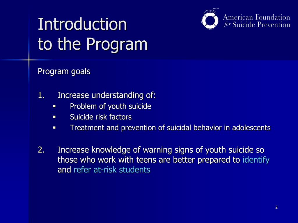 Introduction to the Program Program goals • Increase understanding of: • Problem of youth suicide • Suicide risk factors • Treatment and prevention of suicidal behavior in adolescents • Increase knowledge of warning signs of youth suicide so those who work with teens are better prepared to identify and refer at-risk students
