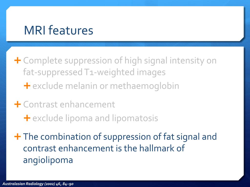 MRI features Complete suppression of high signal intensity on fat-suppressed T1-weighted images exclude melanin or methaemoglobin Contrast enhancement exclude lipoma and lipomatosis Australasian Radiology (2002) 46, 84–90