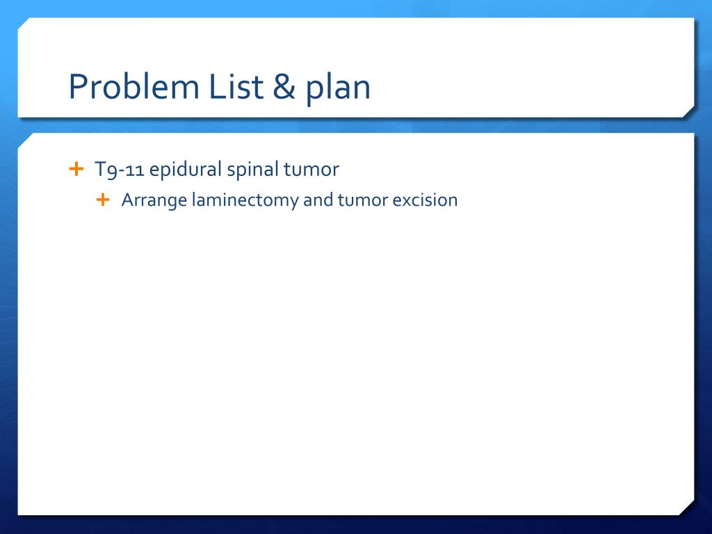 Problem List & plan T9-11 epidural spinal tumor Arrange laminectomy and tumor excision