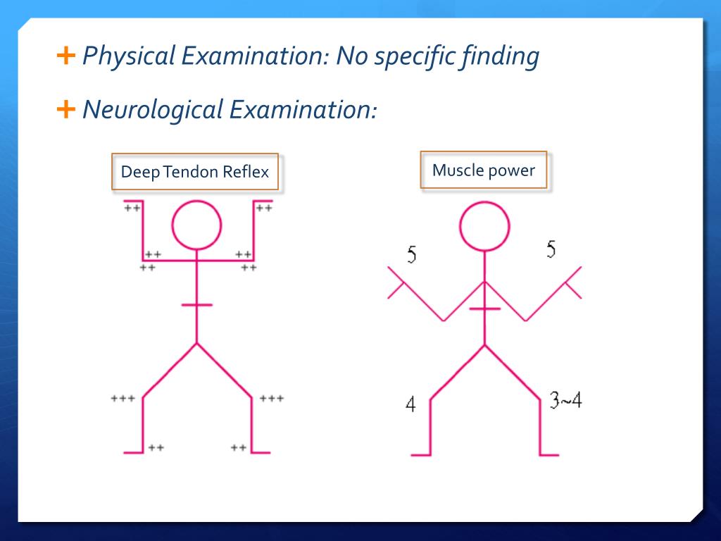 Physical Examination: No specific finding Neurological Examination: Muscle power Deep Tendon Reflex