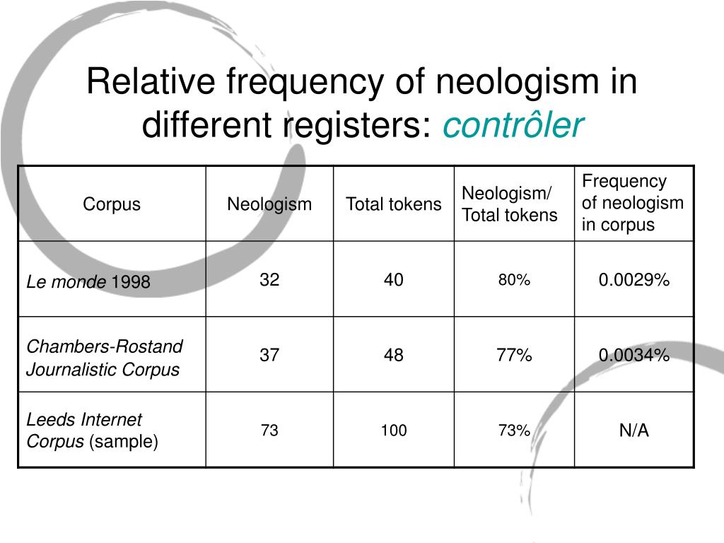 Research questions • What is the extent of usage of the given neologism? In what text types/registers is it most frequent? • Is there evidence that the neologism has displaced either of the following: • the same form with the traditional meaning? • a pre-existing synonymous lexical item? • Is there evidence of ‘specialization’ (restriction) of the neologism with respect to meaning, context, pragmatic function?