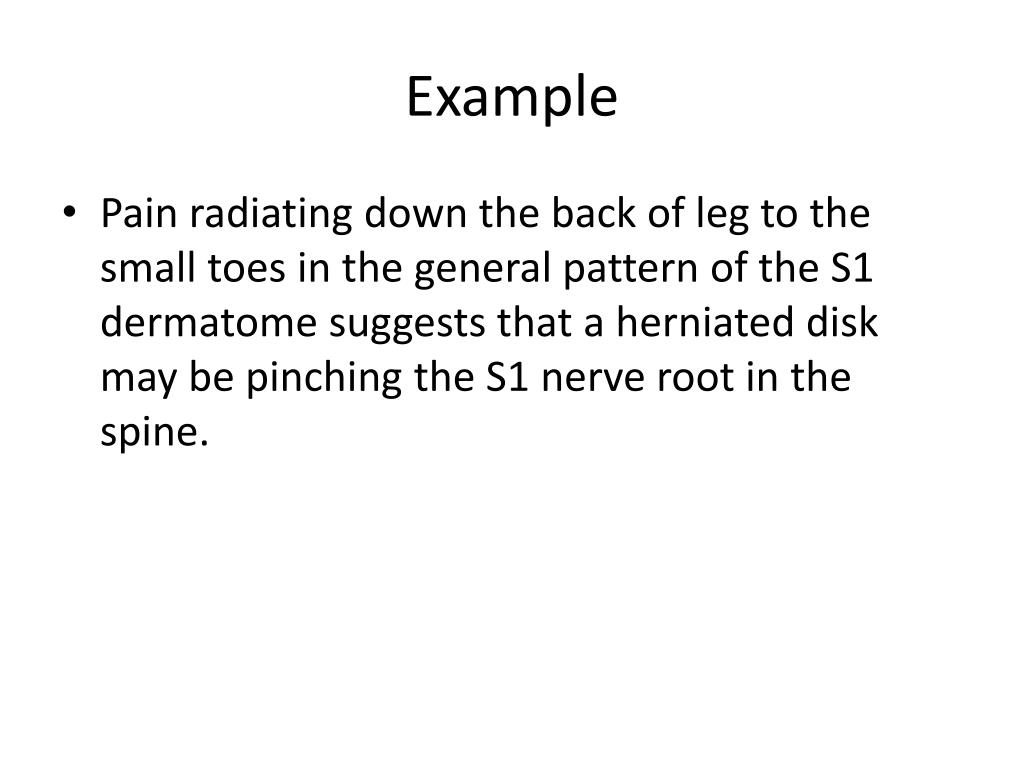 Example • Pain radiating down the back of leg to the small toes in the general pattern of the S1 dermatome suggests that a herniated disk may be pinching the S1 nerve root in the spine.