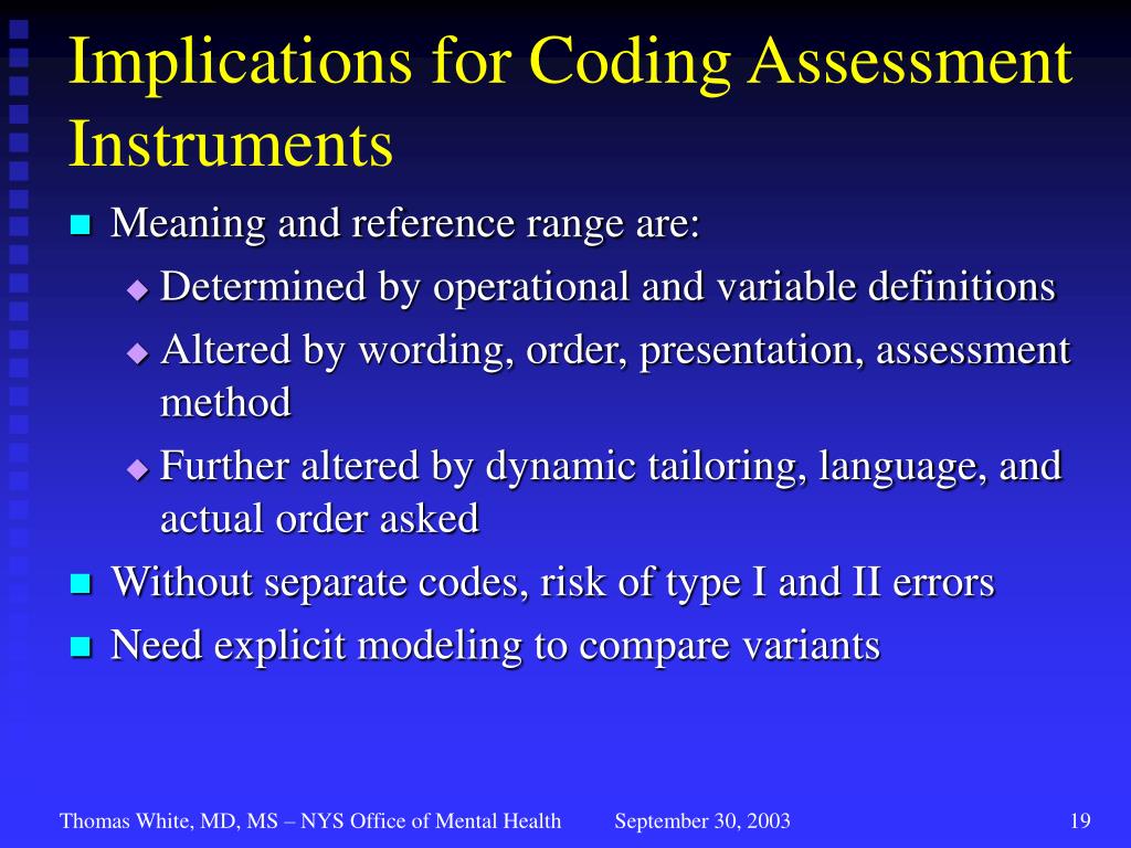 Implications for Coding Assessment Instruments • Meaning and reference range are: • Determined by operational and variable definitions • Altered by wording, order, presentation, assessment method • Further altered by dynamic tailoring, language, and actual order asked • Without separate codes, risk of type I and II errors • Need explicit modeling to compare variants Thomas White, MD, MS – NYS Office of Mental Health