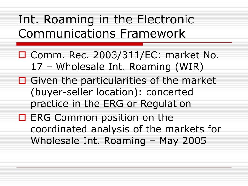 Int. Roaming in the Electronic Communications Framework • Comm. Rec. 2003/311/EC: market No. 17 – Wholesale Int. Roaming (WIR) • Given the particularities of the market (buyer-seller location): concerted practice in the ERG or Regulation • ERG Common position on the coordinated analysis of the markets for Wholesale Int. Roaming – May 2005