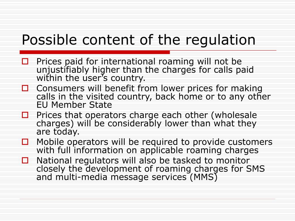 Possible content of the regulation • Prices paid for international roaming will not be unjustifiably higher than the charges for calls paid within the user’s country. • Consumers will benefit from lower prices for making calls in the visited country, back home or to any other EU Member State • Prices that operators charge each other (wholesale charges) will be considerably lower than what they are today. • Mobile operators will be required to provide customers with full information on applicable roaming charges • National regulators will also be tasked to monitor closely the development of roaming charges for SMS and multi-media message services (MMS)