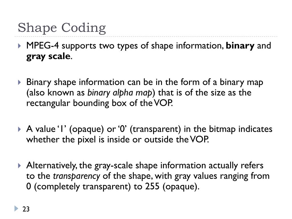 Shape Coding MPEG-4 supports two types of shape information, binary and gray scale. Binary shape information can be in the form of a binary map (also known as binary alpha map) that is of the size as the rectangular bounding box of the VOP. A value ‘1’ (opaque) or ‘0’ (transparent) in the bitmap indicates whether the pixel is inside or outside the VOP. Alternatively, the gray-scale shape information actually refers to the transparency of the shape, with gray values ranging from 0 (completely transparent) to 255 (opaque).