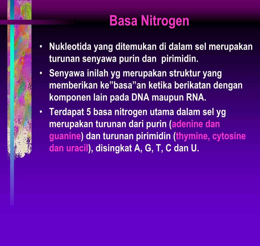 Basa Nitrogen • Nukleotida yang ditemukan di dalam sel merupakan turunan senyawa purin dan pirimidin. • Senyawa inilah yg merupakan struktur yang memberikan ke”basa”an ketika berikatan dengan komponen lain pada DNA maupun RNA. • Terdapat 5 basa nitrogen utama dalam sel yg merupakan turunan dari purin (adenine dan guanine) dan turunan pirimidin (thymine, cytosine dan uracil), disingkat A, G, T, C dan U.