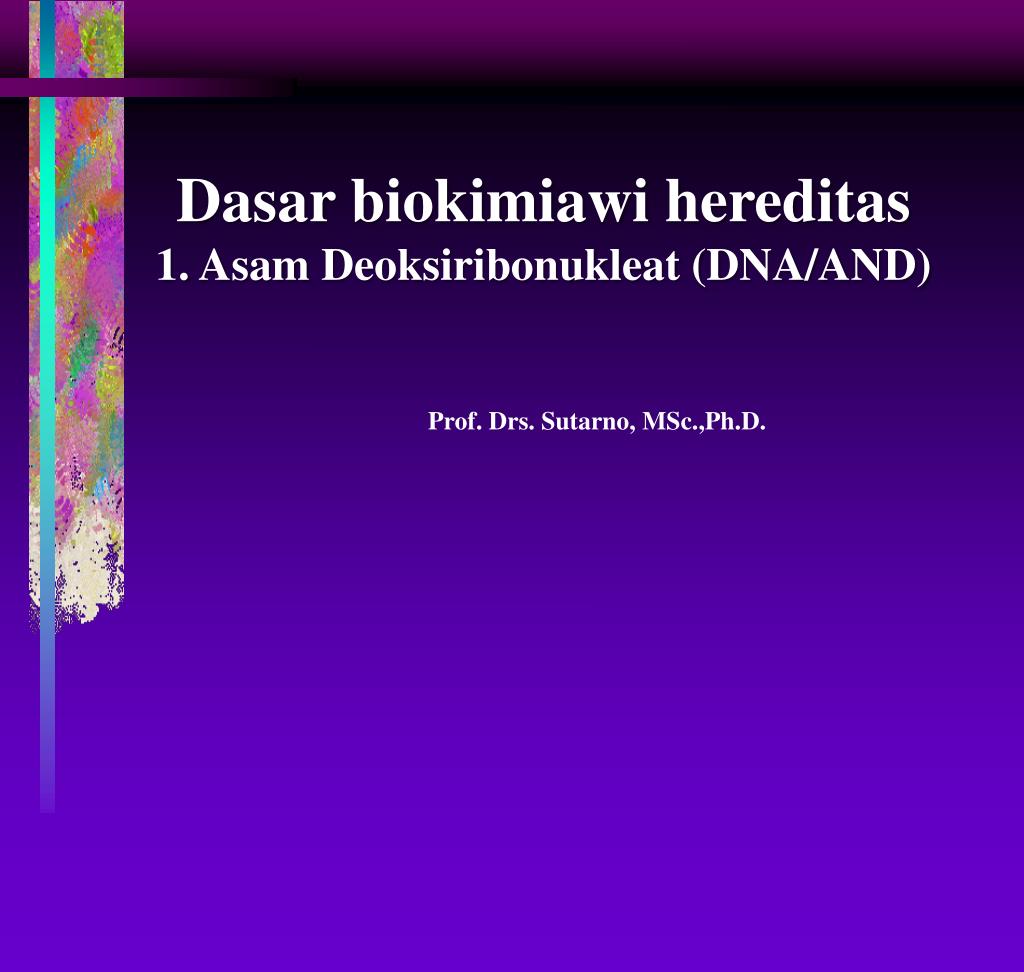 Dasarbiokimiawihereditas 1. AsamDeoksiribonukleat (DNA/AND) Prof. Drs. Sutarno, MSc.,Ph.D.