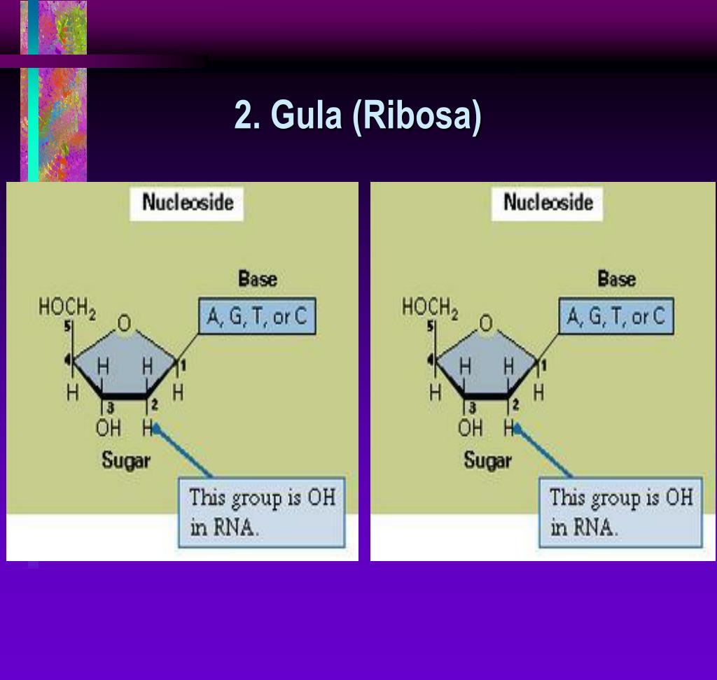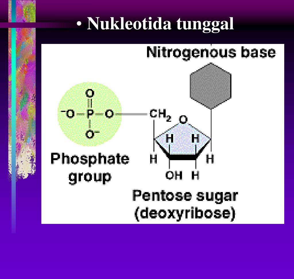 Nukleotida • Nukleosidadidalamselditemukanterutamadalambentukterfosforilasi,strukturinidisebutdenganNukleotida. • Nukleotidamerupakanpenyusunrantai DNA maupun RNA • Sisifosforilasidarinukleotida paling umumditemukandalamseladalahpadagugus hydroxyl yang terikatpadakarbon no 5’dariribosa. Atom karbonpadaribosadiberitanda (') untukmembedakannyadenganpemberiannomorpada backbone basa. Komponenpenyusunnukleotidaterdiridarigugus: • 1. Basanirogen • 2. Gula • 3. Fosfat