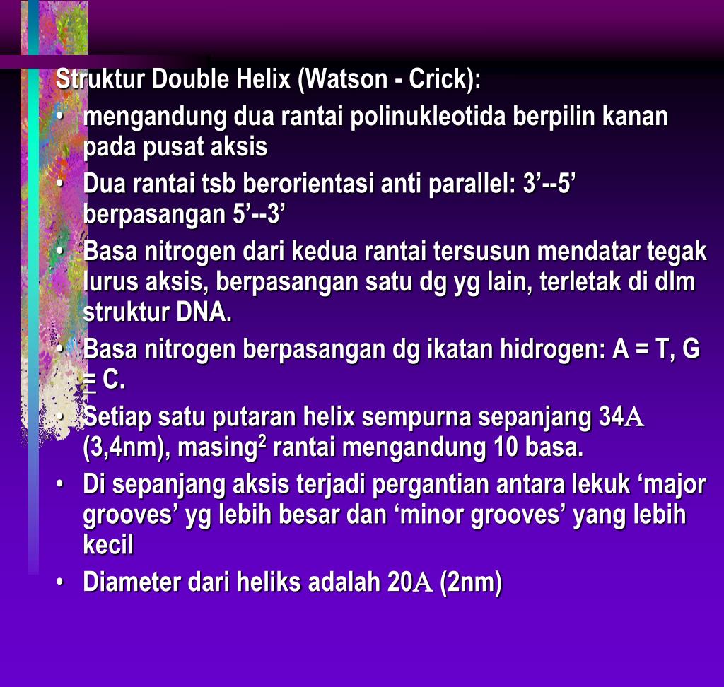 Struktur Double Helix (Watson - Crick): • mengandungduarantaipolinukleotidaberpilinkananpadapusataksis • Duarantaitsbberorientasi anti parallel: 3’--5’ berpasangan 5’--3’ • Basa nitrogen darikeduarantaitersusunmendatartegaklurusaksis, berpasangansatu dg yg lain, terletakdidlmstruktur DNA. • Basa nitrogen berpasangan dg ikatanhidrogen: A = T, G = C. • Setiapsatuputaran helix sempurnasepanjang 34A (3,4nm), masing2rantaimengandung 10 basa. • Di sepanjangaksisterjadipergantianantaralekuk ‘major grooves’ yglebihbesardan ‘minor grooves’ yang lebihkecil • Diameter dariheliksadalah 20A (2nm)