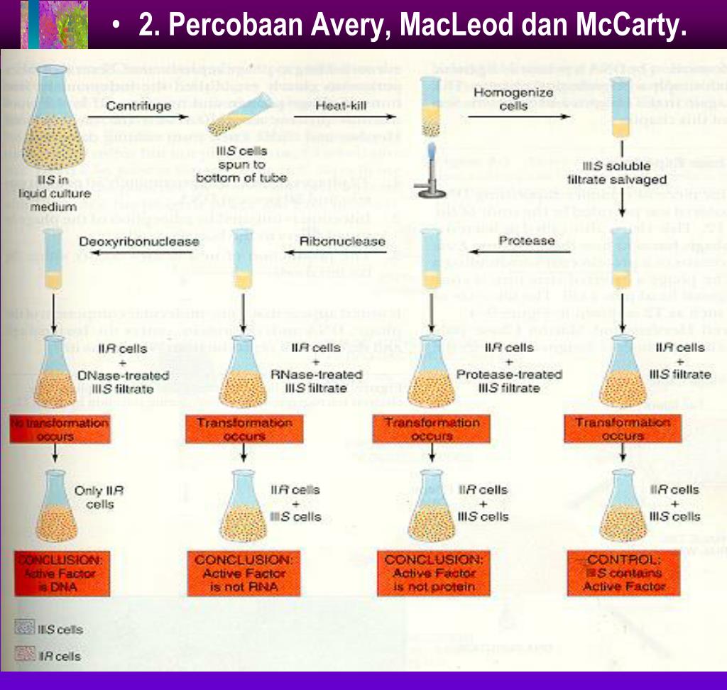 2. Percobaan Avery, MacLeod dan McCarty. • Pengulangan percobaan Griffith: • Menemukan bahwa: • substansi yg menimbulkan perubahan pneumococcus adalah asam nukleat. Transformasi dari S ke R dapat terjadi dlm larutan asam nukleat saja.