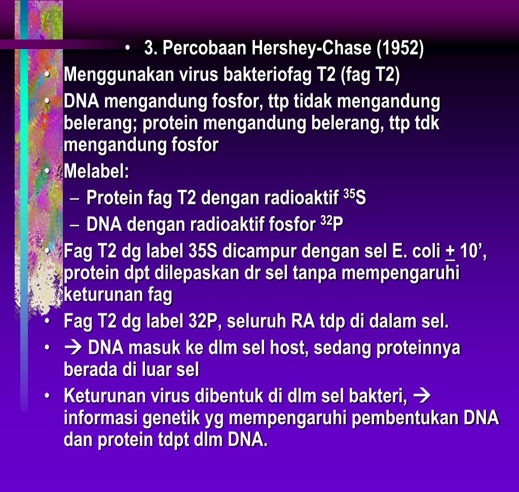 3. Percobaan Hershey-Chase (1952) • Menggunakan virus bakteriofag T2 (fag T2) • DNA mengandung fosfor, ttp tidak mengandung belerang; protein mengandung belerang, ttp tdk mengandung fosfor • Melabel: • Protein fag T2 dengan radioaktif 35S • DNA dengan radioaktif fosfor 32P • Fag T2 dg label 35S dicampur dengan sel E. coli + 10’, protein dpt dilepaskan dr sel tanpa mempengaruhi keturunan fag • Fag T2 dg label 32P, seluruh RA tdp di dalam sel. • DNA masuk ke dlm sel host, sedang proteinnya berada di luar sel • Keturunan virus dibentuk di dlm sel bakteri, informasi genetik yg mempengaruhi pembentukan DNA dan protein tdpt dlm DNA.