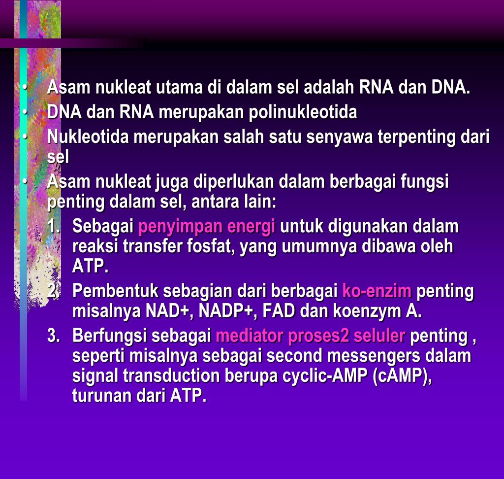 Asamnukleatutamadidalamseladalah RNA dan DNA. • DNA dan RNA merupakanpolinukleotida • Nukleotidamerupakansalahsatusenyawaterpentingdarisel • Asamnukleatjugadiperlukandalamberbagaifungsipentingdalamsel, antara lain: • Sebagaipenyimpanenergiuntukdigunakandalamreaksi transfer fosfat, yang umumnyadibawaoleh ATP. • Pembentuksebagiandariberbagaiko-enzimpentingmisalnya NAD+, NADP+, FAD dankoenzym A. • Berfungsisebagaimediator proses2 selulerpenting , sepertimisalnyasebagai second messengers dalam signal transduction berupa cyclic-AMP (cAMP), turunandari ATP.