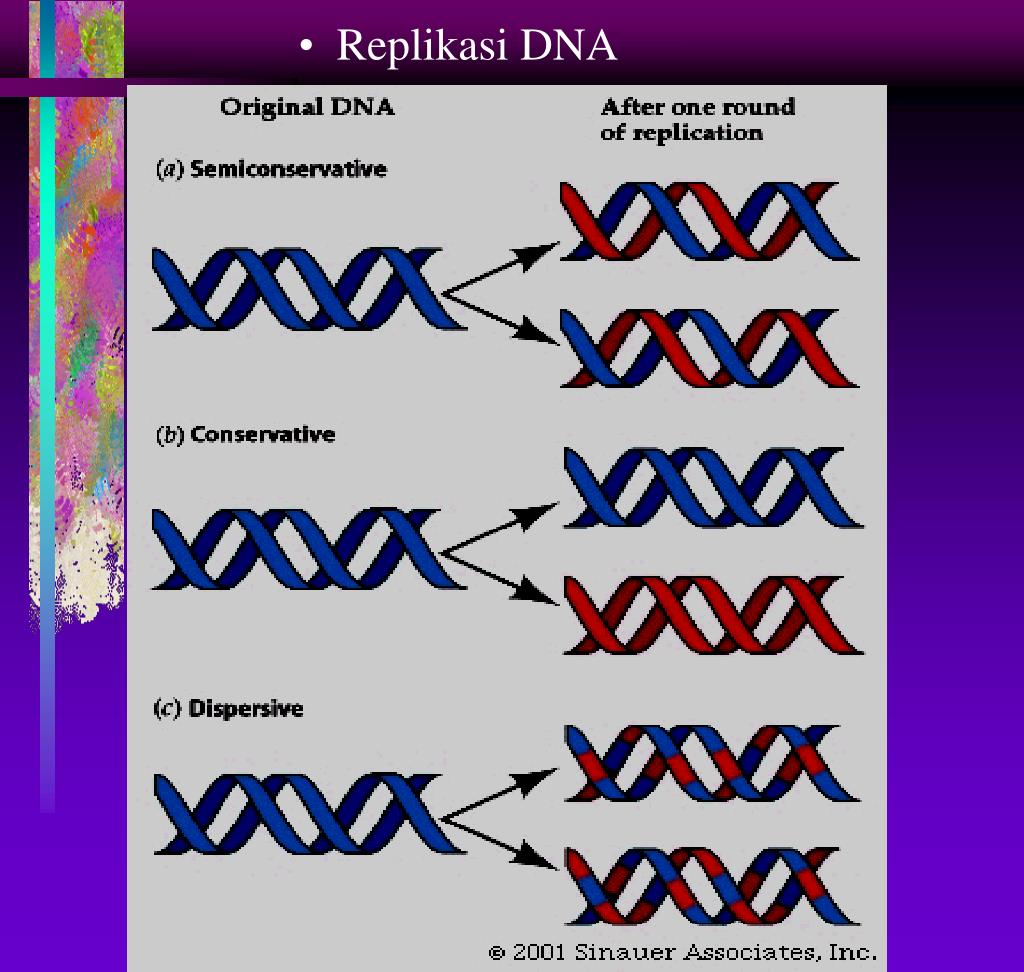 REPLIKASI DNA • Pembelahan sel selalu didahului oleh pembelahan inti --> tjd pembelahan kromosom (DNA). • 3 model replikasi: • Semikonservatif (Watson-Crick): DNA lama membuka scr enzimatis, disamping pita yg lama dibentuk pita DNA baru. • Konservatif: DNA lama tetap (double helix tidak membuka), disamping DNA lama ini dibentuk DNA baru • Dispersif: Molekul DNA putus menjadi beberapa bagian, setiap potongan dibentuk DNA baru. (paling kompleks, sulit diterima).