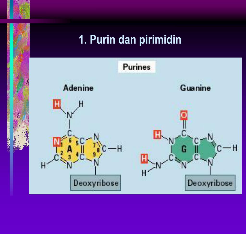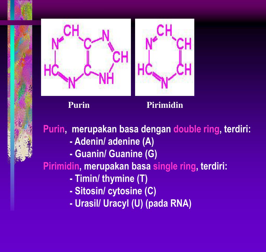 Purin Pirimidin Purin, merupakan basa dengan double ring, terdiri: - Adenin/ adenine (A) - Guanin/ Guanine (G) Pirimidin, merupakan basa single ring, terdiri: - Timin/ thymine (T) - Sitosin/ cytosine (C) - Urasil/ Uracyl (U) (pada RNA)