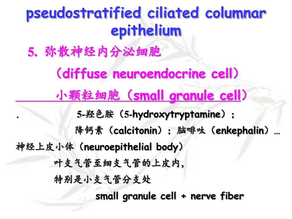 pseudostratified ciliated columnar epithelium 5. 弥散神经内分泌细胞 (diffuse neuroendocrine cell) 小颗粒细胞(small granule cell) . 5-羟色胺(5-hydroxytryptamine); 降钙素(calcitonin);脑啡呔(enkephalin)… 神经上皮小体(neuroepithelial body) 叶支气管至细支气管的上皮内, 特别是小支气管分支处 small granule cell + nerve fiber