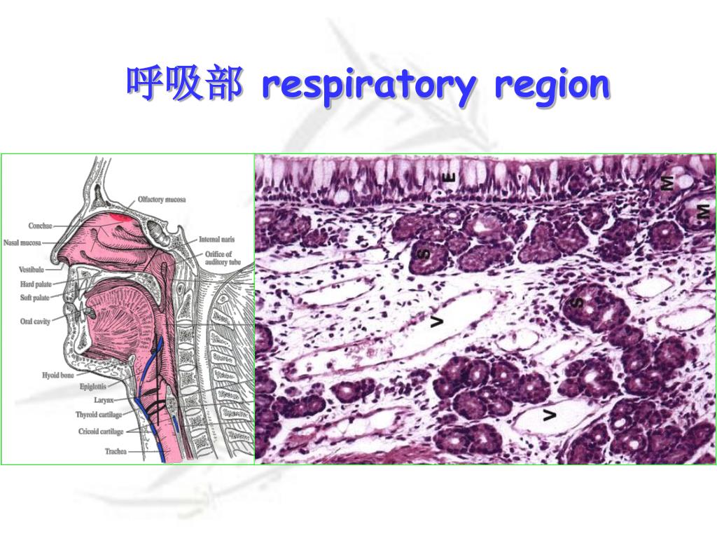 呼吸部 respiratory region 假复层纤毛柱状上皮 pseudostratified ciliated columnar epithelium 固有层 lamina propria:loose connective tissue 鼻腺(nasal gland):mixed 静脉丛 淋巴组织 The mucosa of the respiratory segment warms, moistens, and filters inspired air.