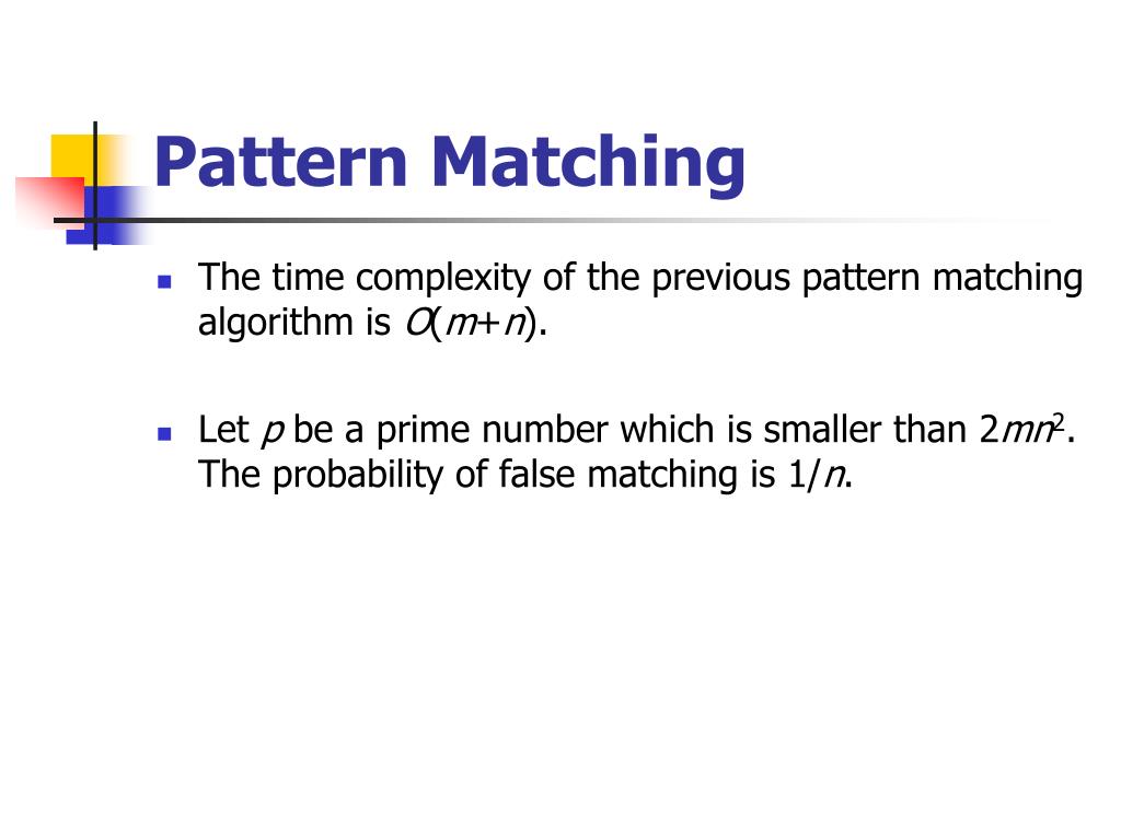 Pattern Matching • The time complexity of the previous pattern matching algorithm is O(m+n). • Let p be a prime number which is smaller than 2mn2. The probability of false matching is 1/n.