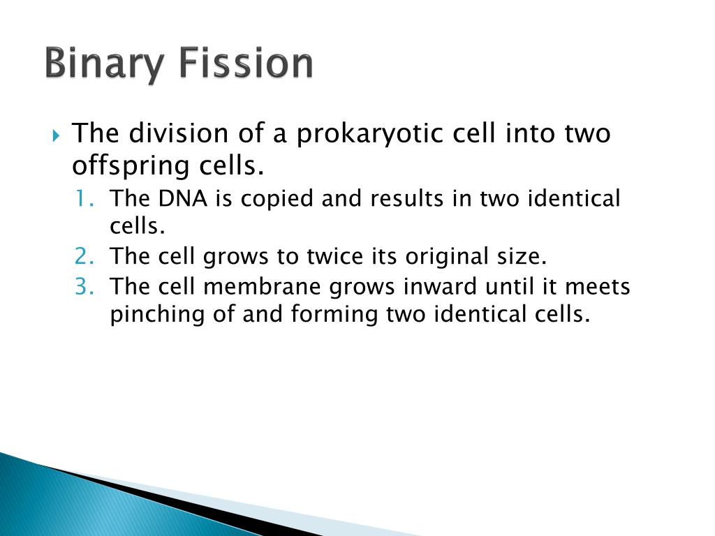 Binary Fission • The division of a prokaryotic cell into two offspring cells. • The DNA is copied and results in two identical cells. • The cell grows to twice its original size. • The cell membrane grows inward until it meets pinching of and forming two identical cells.