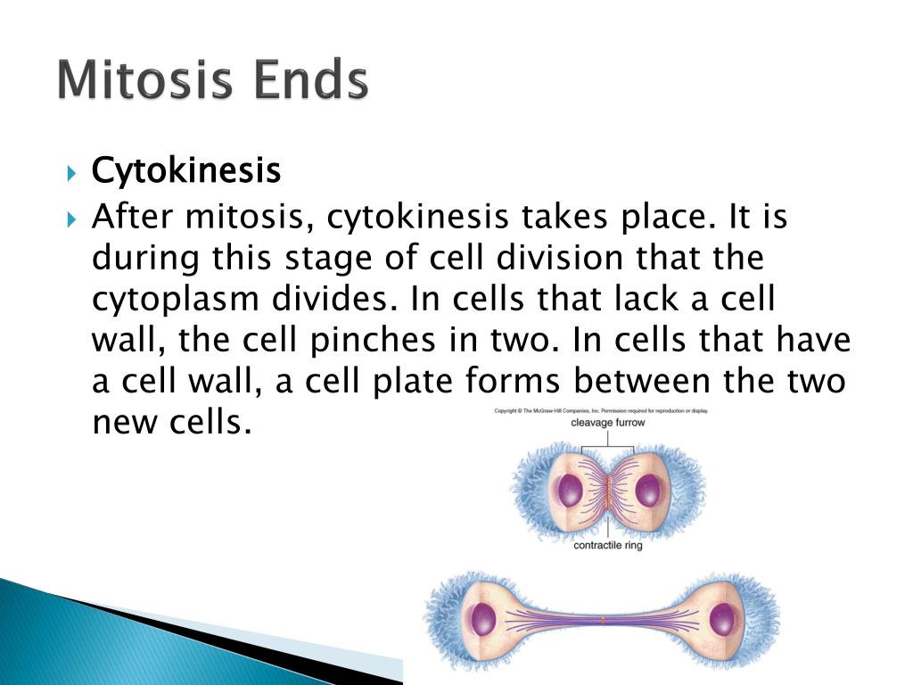 Mitosis Ends • Cytokinesis • After mitosis, cytokinesis takes place. It is during this stage of cell division that the cytoplasm divides. In cells that lack a cell wall, the cell pinches in two. In cells that have a cell wall, a cell plate forms between the two new cells.
