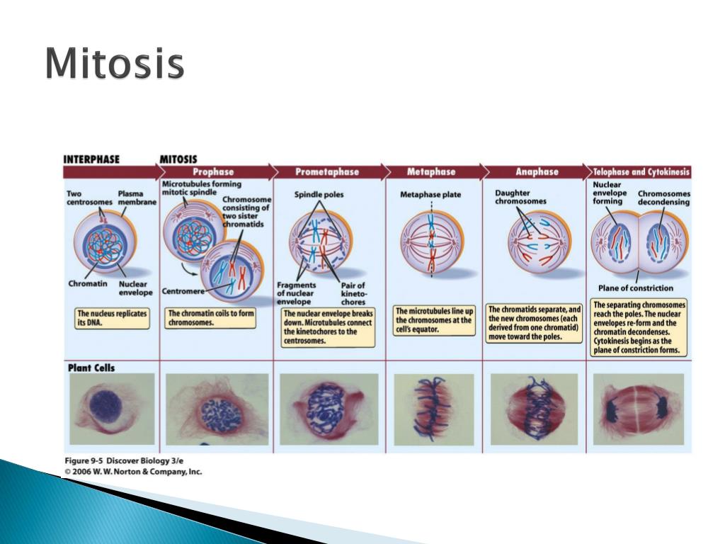 Mitosis Begins Prophase • Genetic material (chromatin) condenses into rod-like structures called chromosomes Metaphase • Chromosomes line-up along the equator of the cell. Anaphase • Chromatids separate and move to opposite sides of the cell Telophase • A nuclear membrane forms around each set of chromosomes and mitosis is complete.