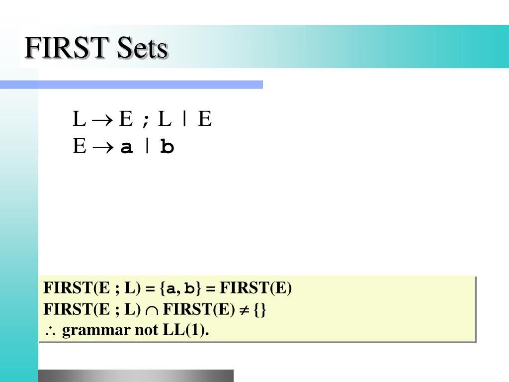 FIRST Sets • L E ; L | EE a | b FIRST(E ; L) = {a, b} = FIRST(E) FIRST(E ; L) FIRST(E) {} grammar not LL(1).