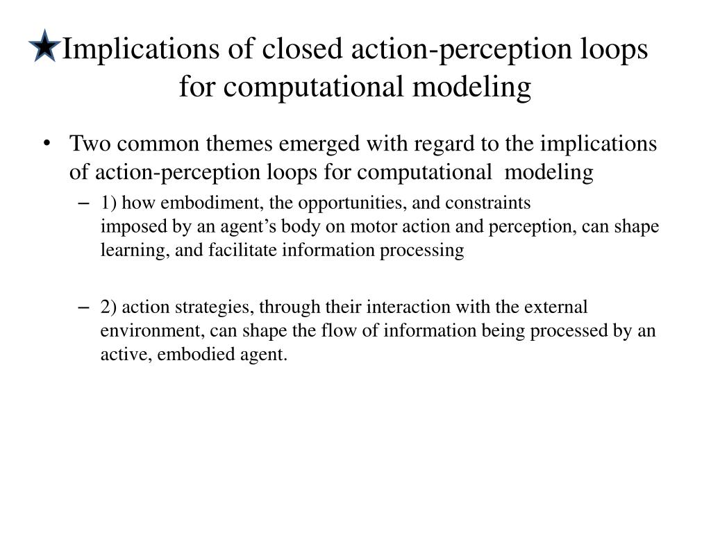 Implications of closed action-perception loops for computational modeling • Two common themes emerged with regard to the implications of action-perception loops for computational modeling • 1) how embodiment, the opportunities, and constraintsimposed by an agent’s body on motor action and perception, can shape learning, and facilitate information processing • 2) action strategies, through their interaction with the external environment, can shape the flow of information being processed by an active, embodied agent.