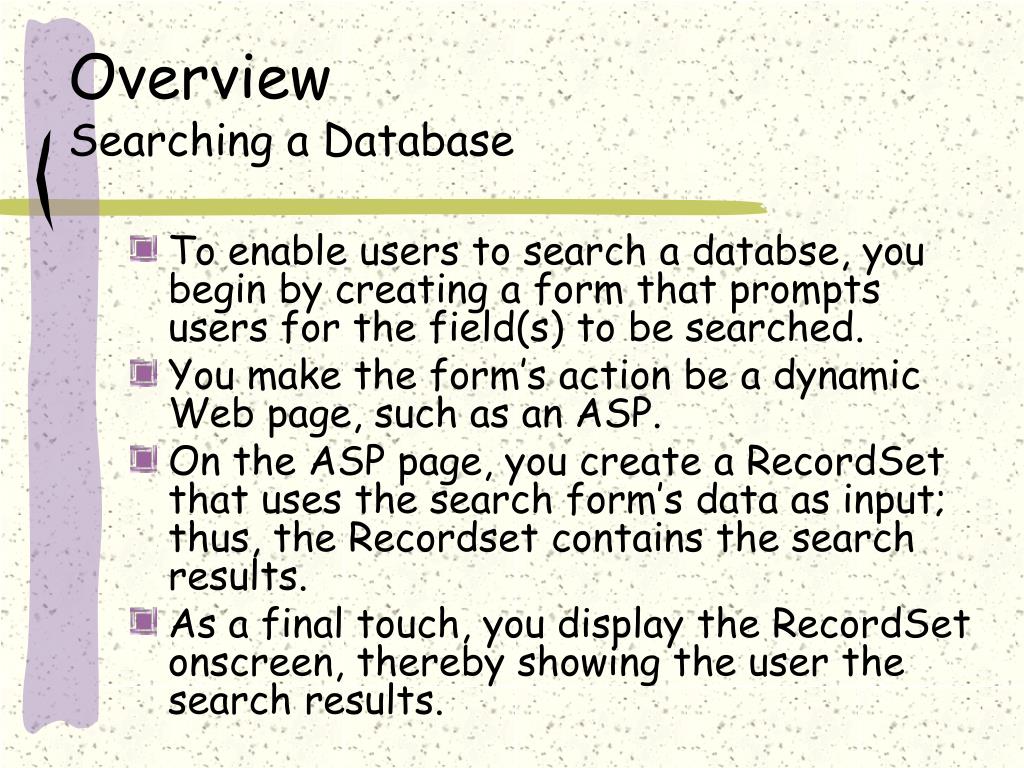 OverviewSearching a Database • To enable users to search a databse, you begin by creating a form that prompts users for the field(s) to be searched. • You make the form’s action be a dynamic Web page, such as an ASP. • On the ASP page, you create a RecordSet that uses the search form’s data as input; thus, the Recordset contains the search results. • As a final touch, you display the RecordSet onscreen, thereby showing the user the search results.
