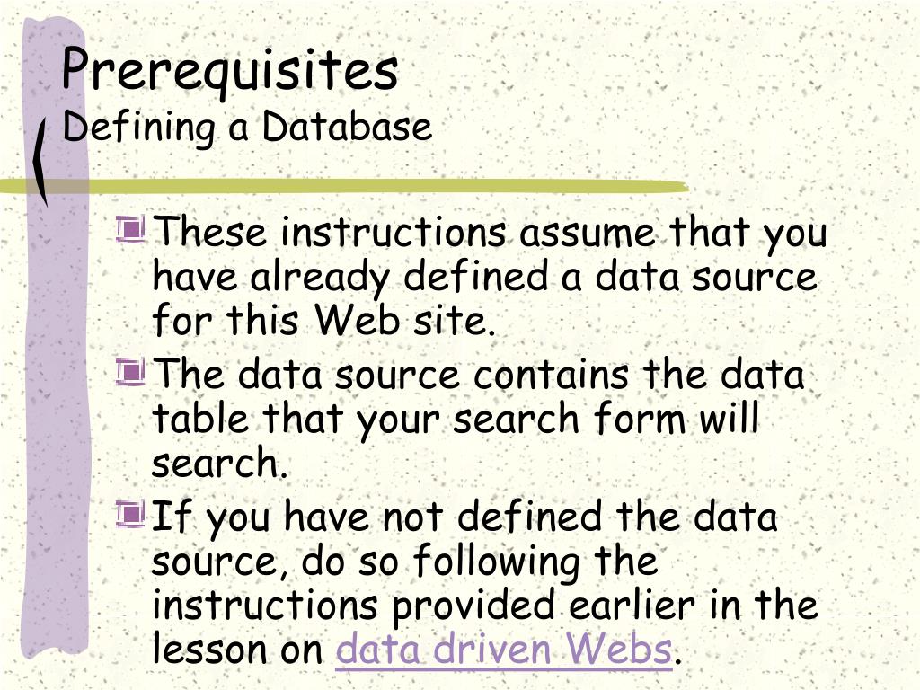 PrerequisitesDefining a Database • These instructions assume that you have already defined a data source for this Web site. • The data source contains the data table that your search form will search. • If you have not defined the data source, do so following the instructions provided earlier in the lesson on data driven Webs.