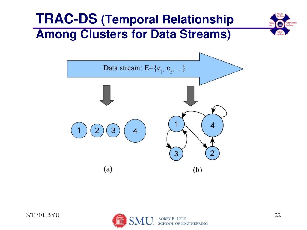 TRAC-DS Definition Given a data stream clustering ζ, a temporal relationship among clusters (TRAC-DS) overlays a data stream clustering ζ with a EMM M, in such a way that the following are satisfied: (1) There is a one-to-one correspondence between the clusters in ζ and the states S in M. (2) A transition aij in the EMM M represents the probability that given a data point in cluster i, the next data point in the data stream will belong to cluster j with i; j = 1; 2; : : : ; k. (3) The EMM M is created online together with the data stream clustering