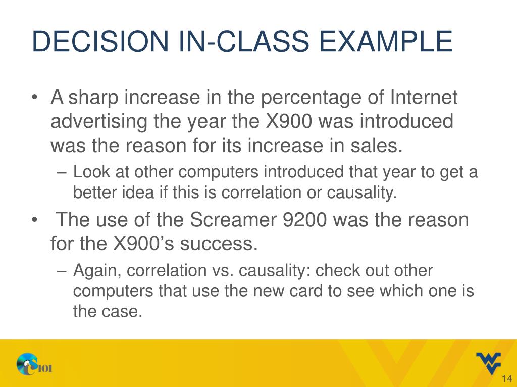 Decision In-Class Example • A sharp increase in the percentage of Internet advertising the year the X900 was introduced was the reason for its increase in sales. • Look at other computers introduced that year to get a better idea if this is correlation or causality. • The use of the Screamer 9200 was the reason for the X900’s success. • Again, correlation vs. causality: check out other computers that use the new card to see which one is the case.