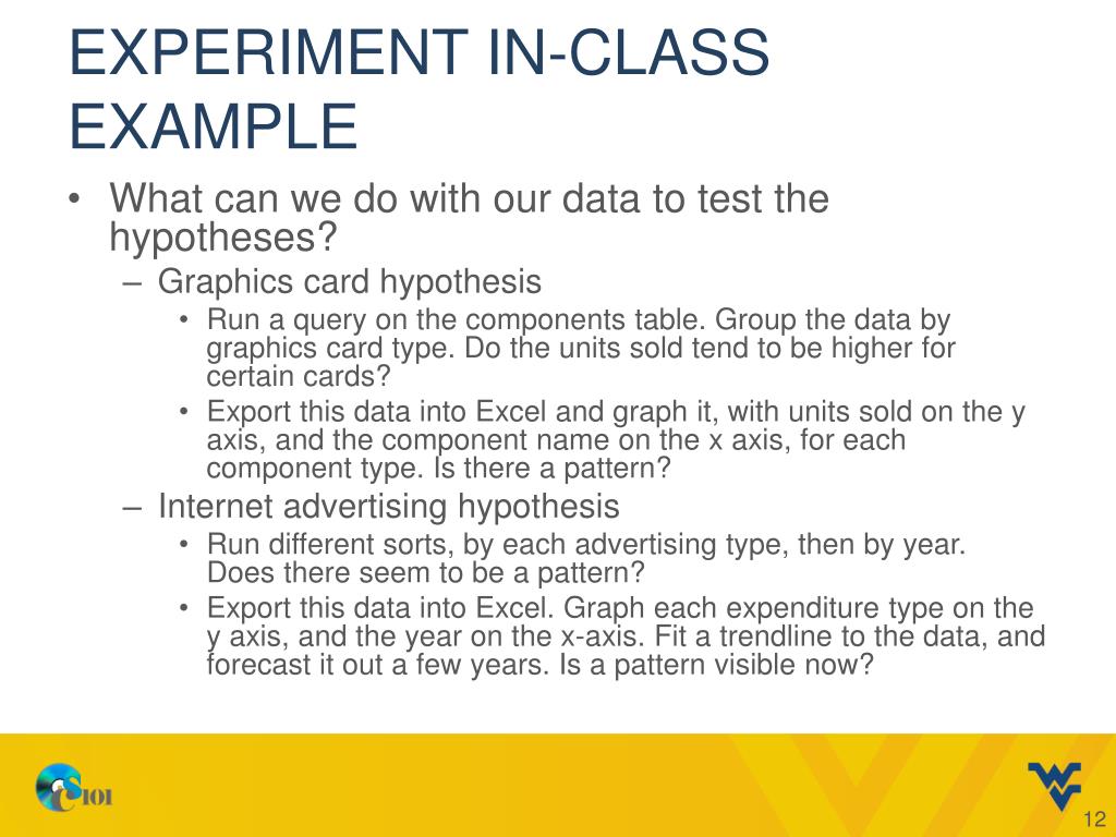 Experiment In-Class Example • What can we do with our data to test the hypotheses? • Graphics card hypothesis • Run a query on the components table. Group the data by graphics card type. Do the units sold tend to be higher for certain cards? • Export this data into Excel and graph it, with units sold on the y axis, and the component name on the x axis, for each component type. Is there a pattern? • Internet advertising hypothesis • Run different sorts, by each advertising type, then by year. Does there seem to be a pattern? • Export this data into Excel. Graph each expenditure type on the y axis, and the year on the x-axis. Fit a trendline to the data, and forecast it out a few years. Is a pattern visible now?