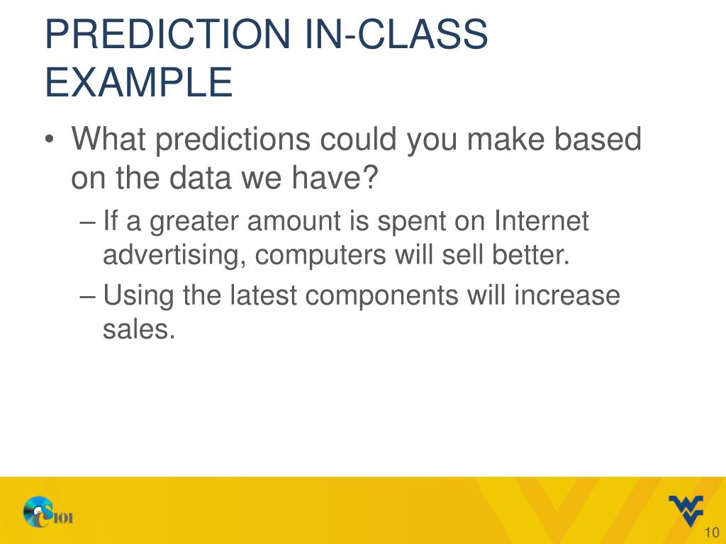 Prediction In-Class Example • What predictions could you make based on the data we have? • If a greater amount is spent on Internet advertising, computers will sell better. • Using the latest components will increase sales.