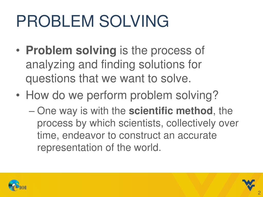 Problem Solving • Problem solving is the process of analyzing and finding solutions for questions that we want to solve. • How do we perform problem solving? • One way is with the scientific method, the process by which scientists, collectively over time, endeavor to construct an accurate representation of the world.