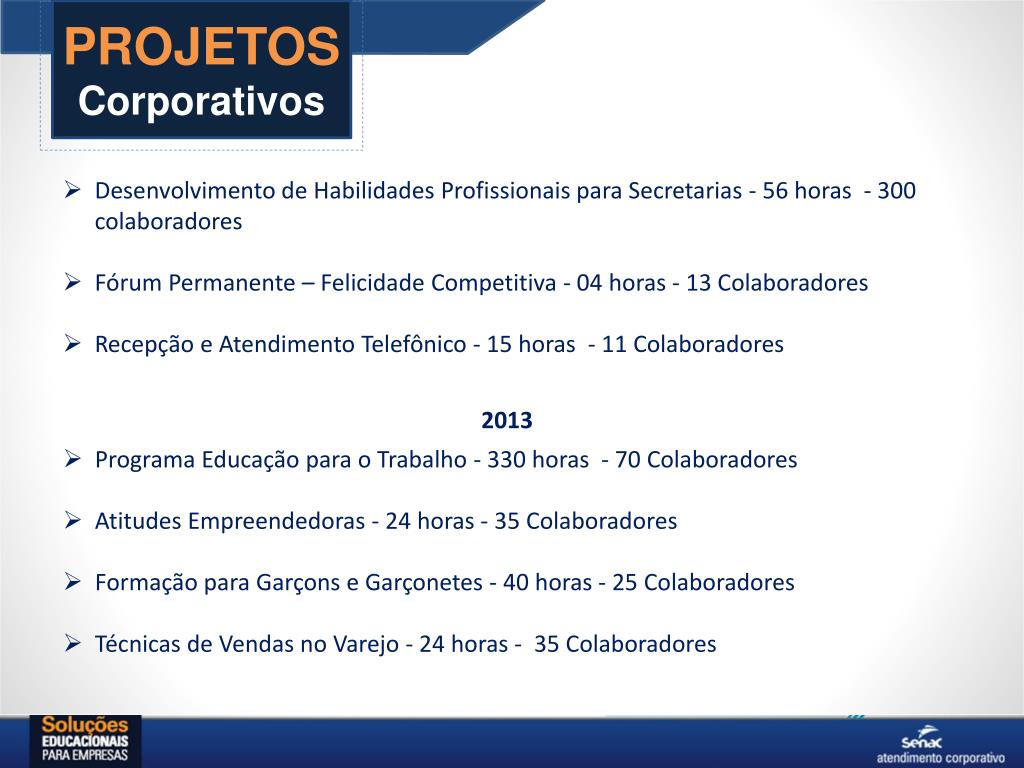 PROJETOSCorporativos • Desenvolvimento de Habilidades Profissionais para Secretarias - 56 horas - 300 colaboradores • Fórum Permanente – Felicidade Competitiva - 04 horas - 13 Colaboradores • Recepção e Atendimento Telefônico - 15 horas - 11 Colaboradores • 2013 • Programa Educação para o Trabalho - 330 horas - 70 Colaboradores • Atitudes Empreendedoras - 24 horas - 35 Colaboradores • Formação para Garçons e Garçonetes - 40 horas - 25 Colaboradores • Técnicas de Vendas no Varejo - 24 horas - 35 Colaboradores