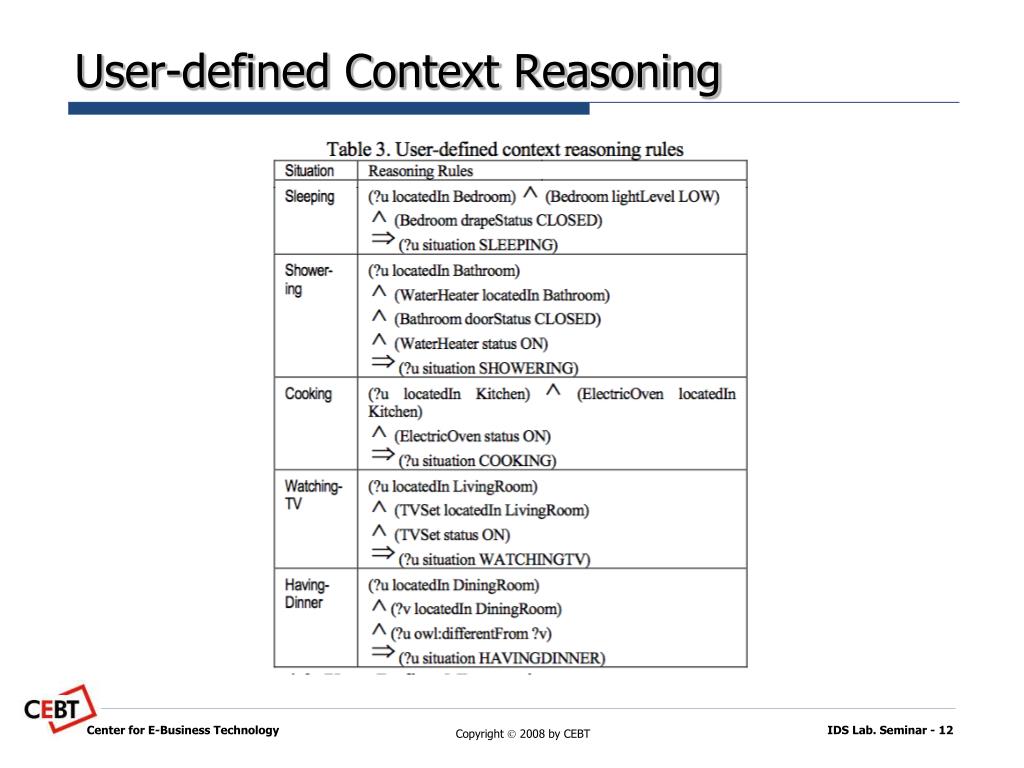 Context Reasoning • The authors present a smart phone scenario • E.g. when the user is sleeping in the bedroom or taking a shower in the bathroom, incoming calls are forwarded to voice mail box • The use of context reasoning has two folds • Checking the consistency of context • Deducing high-level implicit context from low-level explicit context • Two categories of context reasoning • Ontology reasoning • User-defined reasoning Center for E-Business Technology