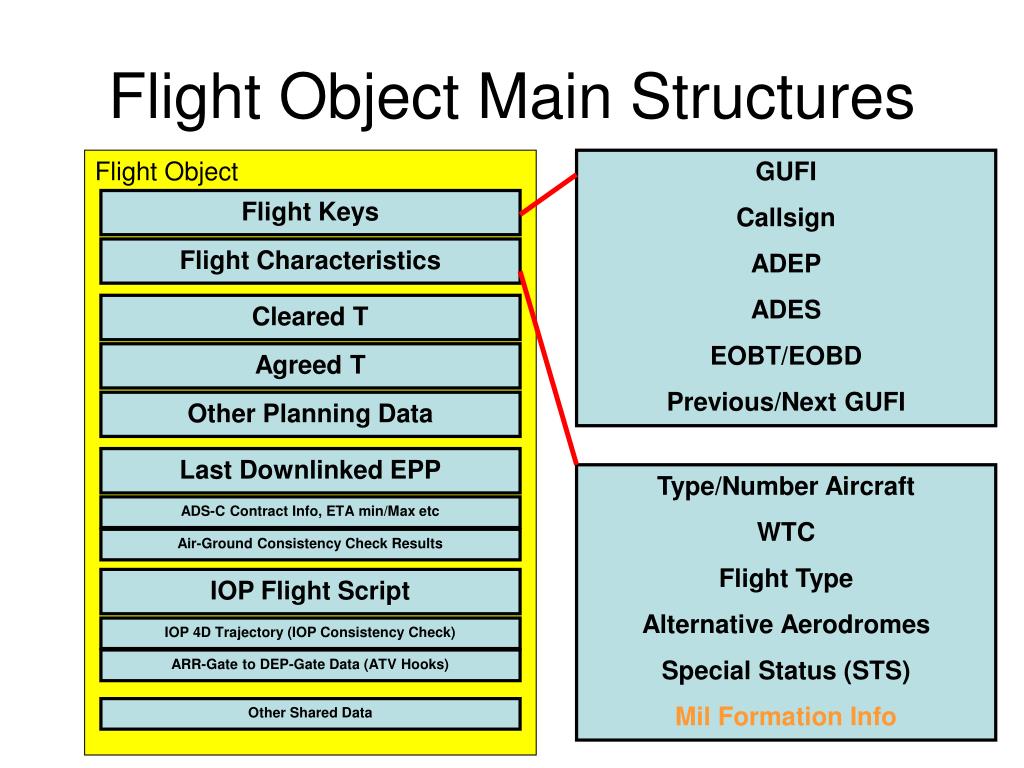 Flight Keys Flight Characteristics Cleared T Agreed T IOP Flight Script IOP 4D Trajectory (IOP Consistency Check) Other Planning Data Last Downlinked EPP ADS-C Contract Info, ETA min/Max etc Air-Ground Consistency Check Results ARR-Gate to DEP-Gate Data (ATV Hooks) Flight Object Main Structures Flight Object GUFI Callsign ADEP ADES EOBT/EOBD Previous/Next GUFI Type/Number Aircraft WTC Flight Type Alternative Aerodromes Special Status (STS) Mil Formation Info Other Shared Data