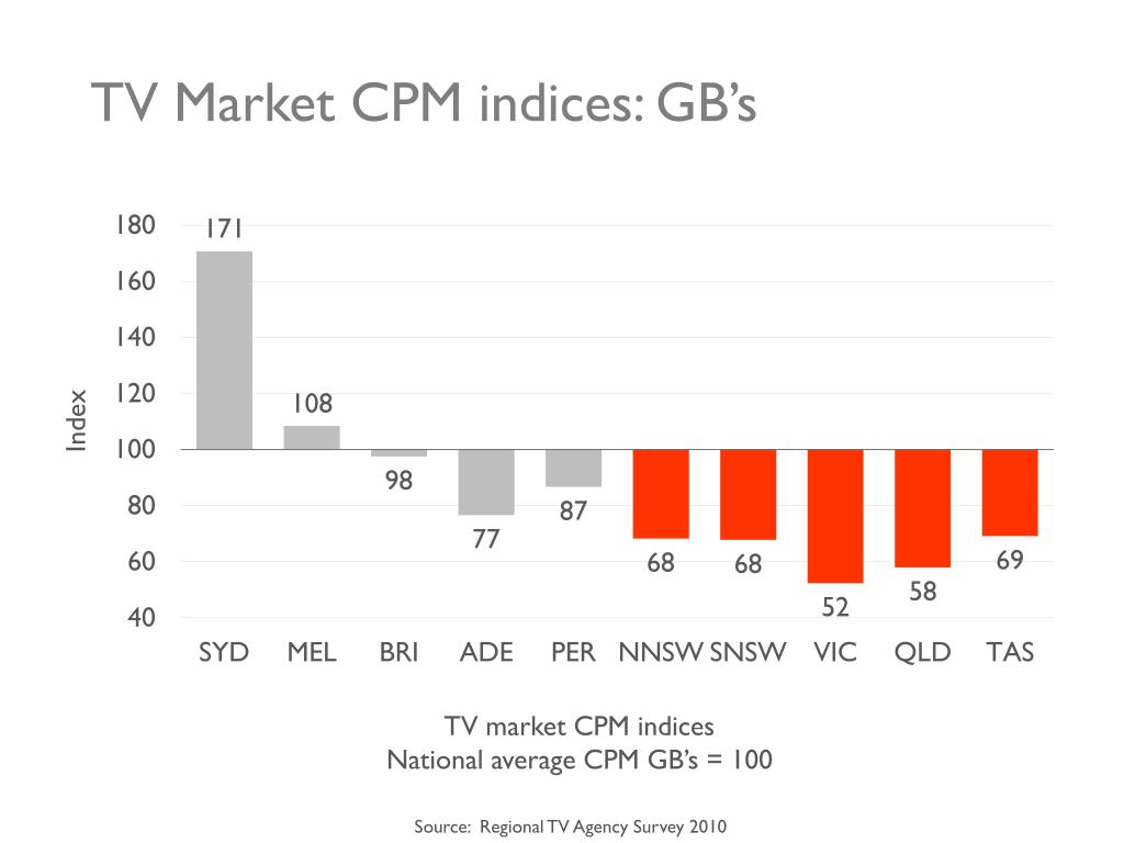 TV Market CPM indices: GB’s Index TV market CPM indices National average CPM GB’s = 100 Source: Regional TV Agency Survey 2010