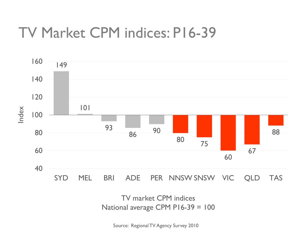 TV Market CPM indices: P16-39 Index TV market CPM indices National average CPM P16-39 = 100 Source: Regional TV Agency Survey 2010